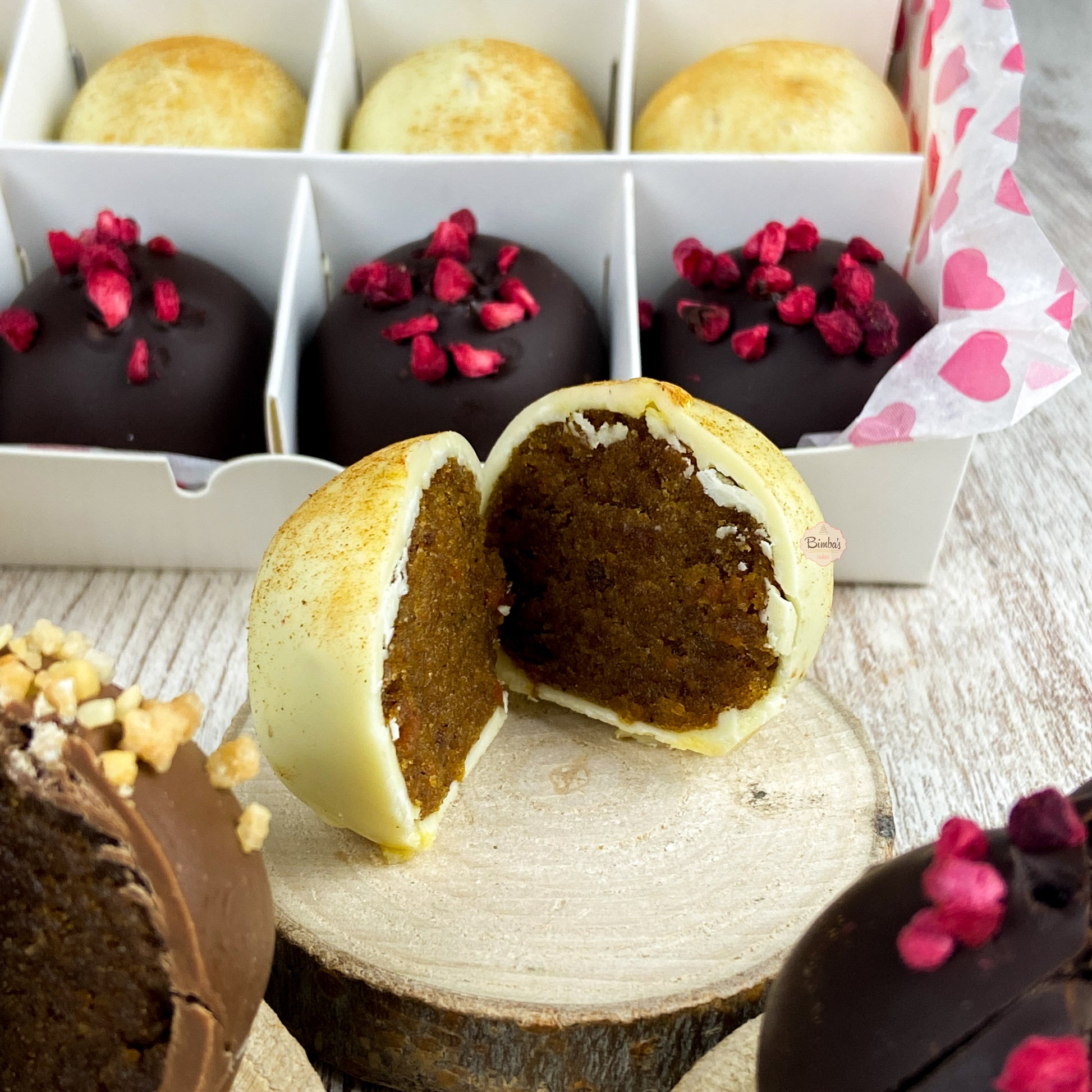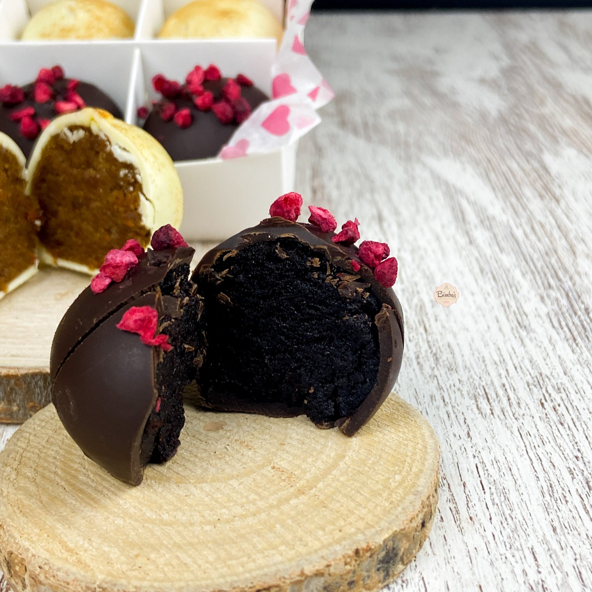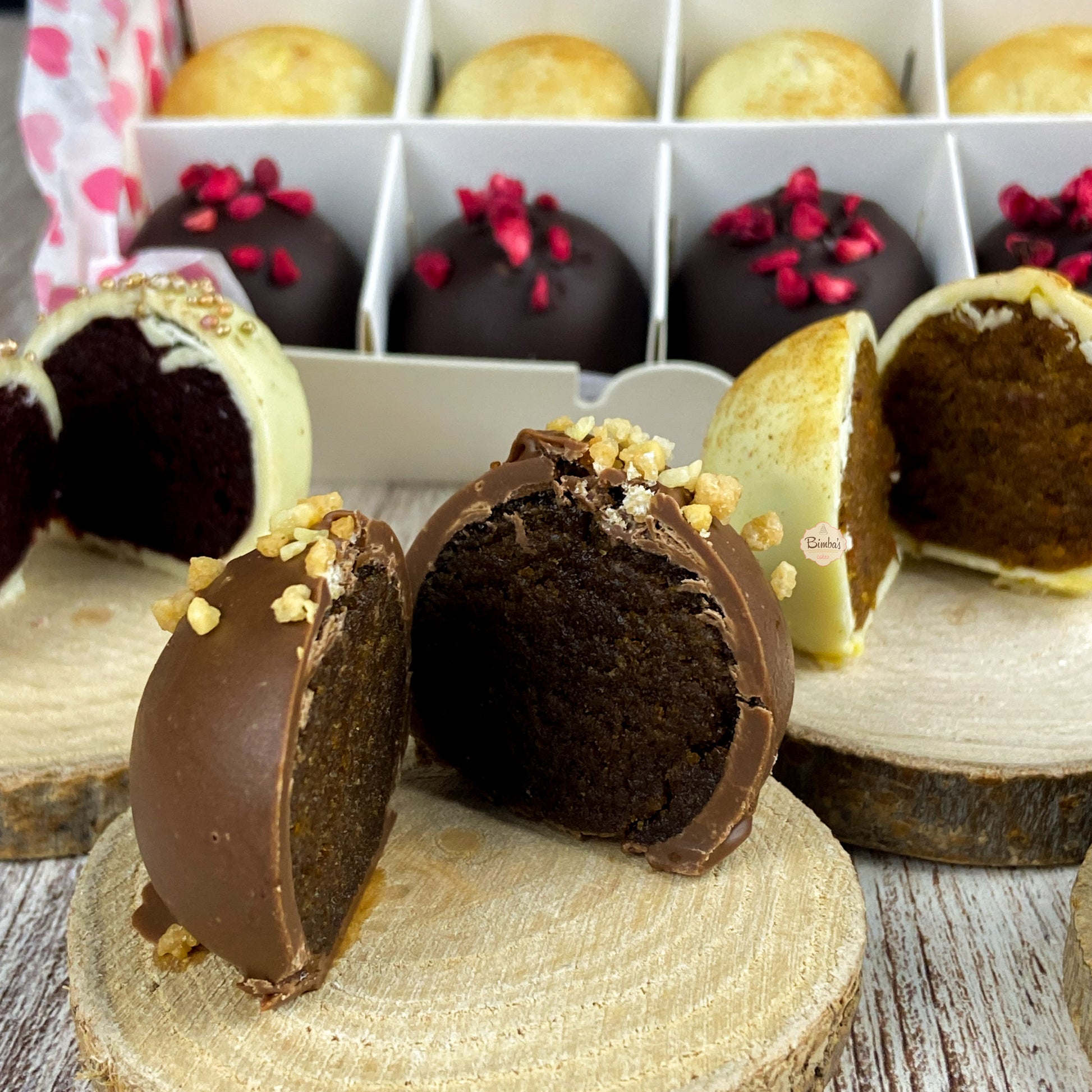 Trufas de nuestro bizcocho con crema bañadas de chocolate blanco, con leche o negro
