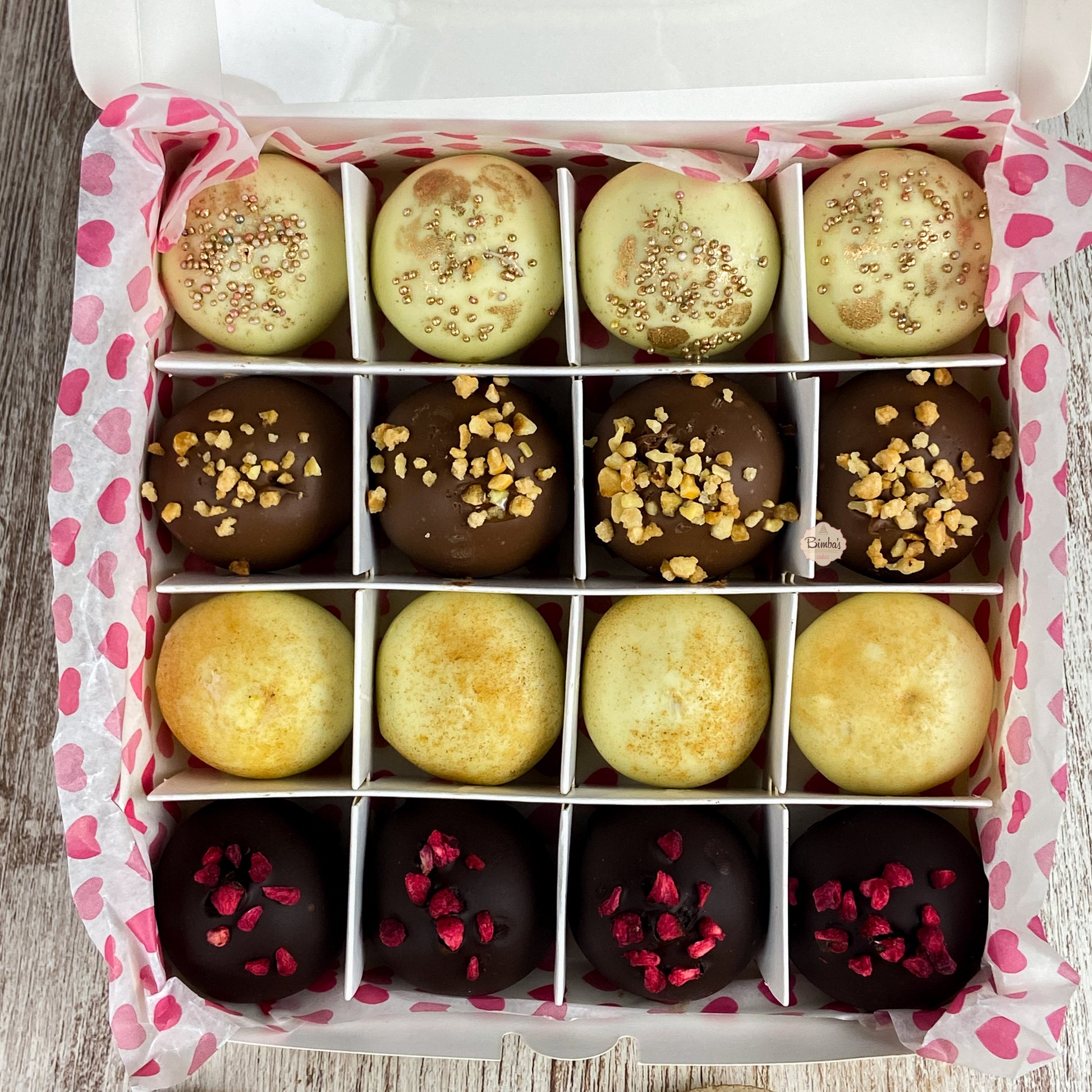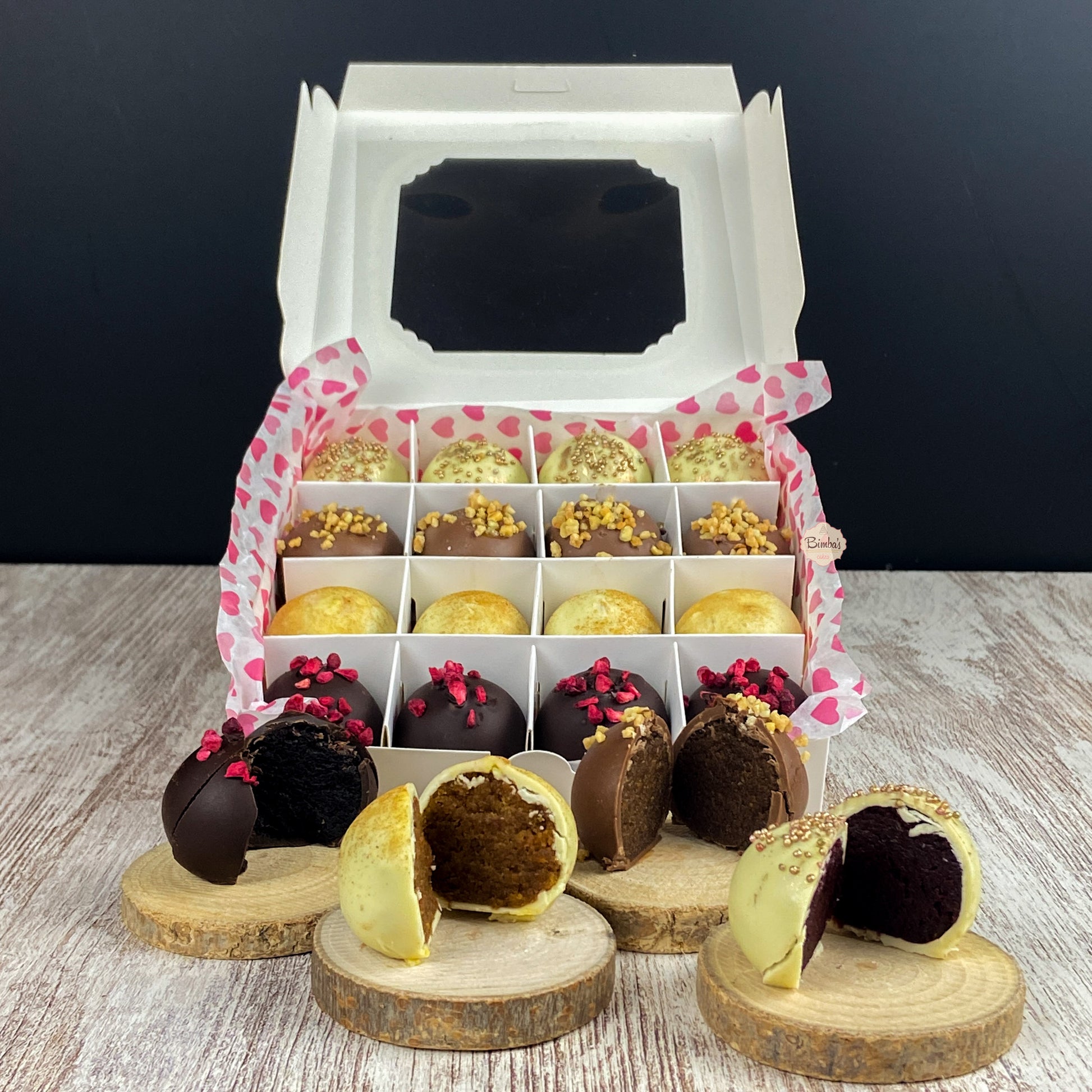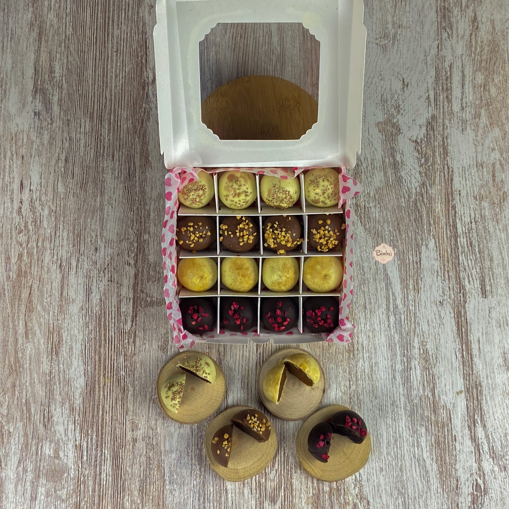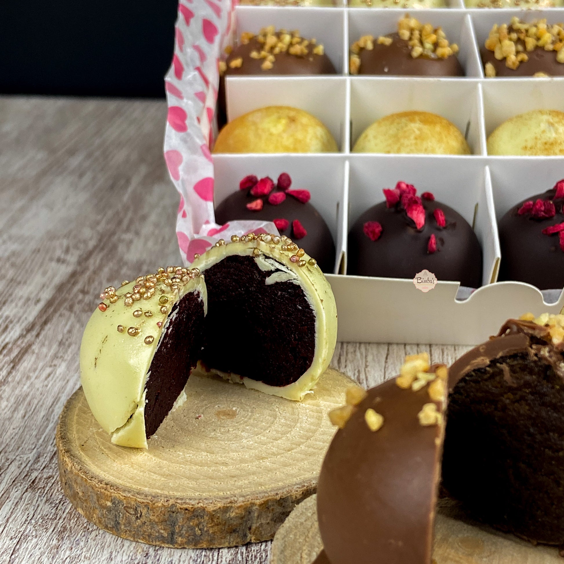Trufas de nuestro bizcocho con crema bañadas de chocolate blanco, con leche o negro