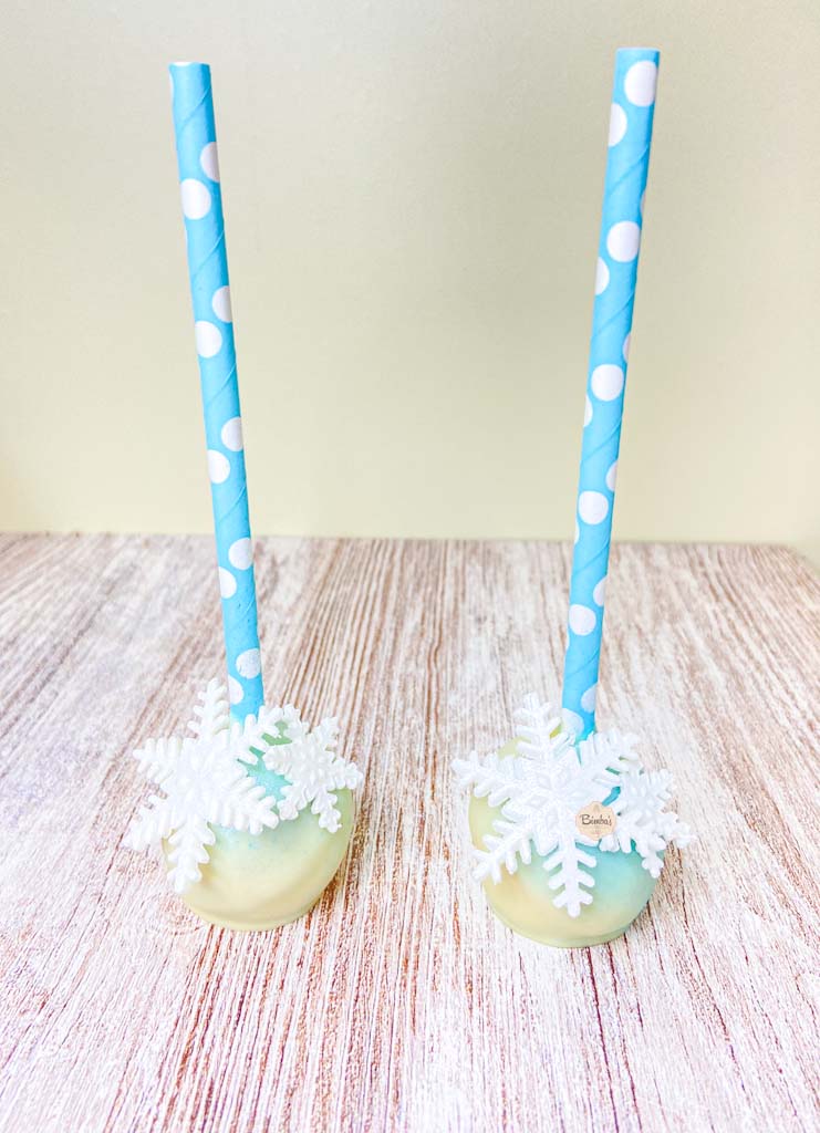 Deliciosas bolas de bizcocho bañadas en chocolate blanco y decoradas con estrella de hielo.