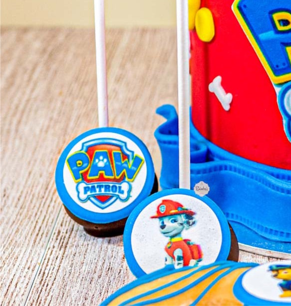 Deliciosas bolas de bizcocho bañadas en chocolate y decoradas con papel comestible con los dibujos de patrulla canina.