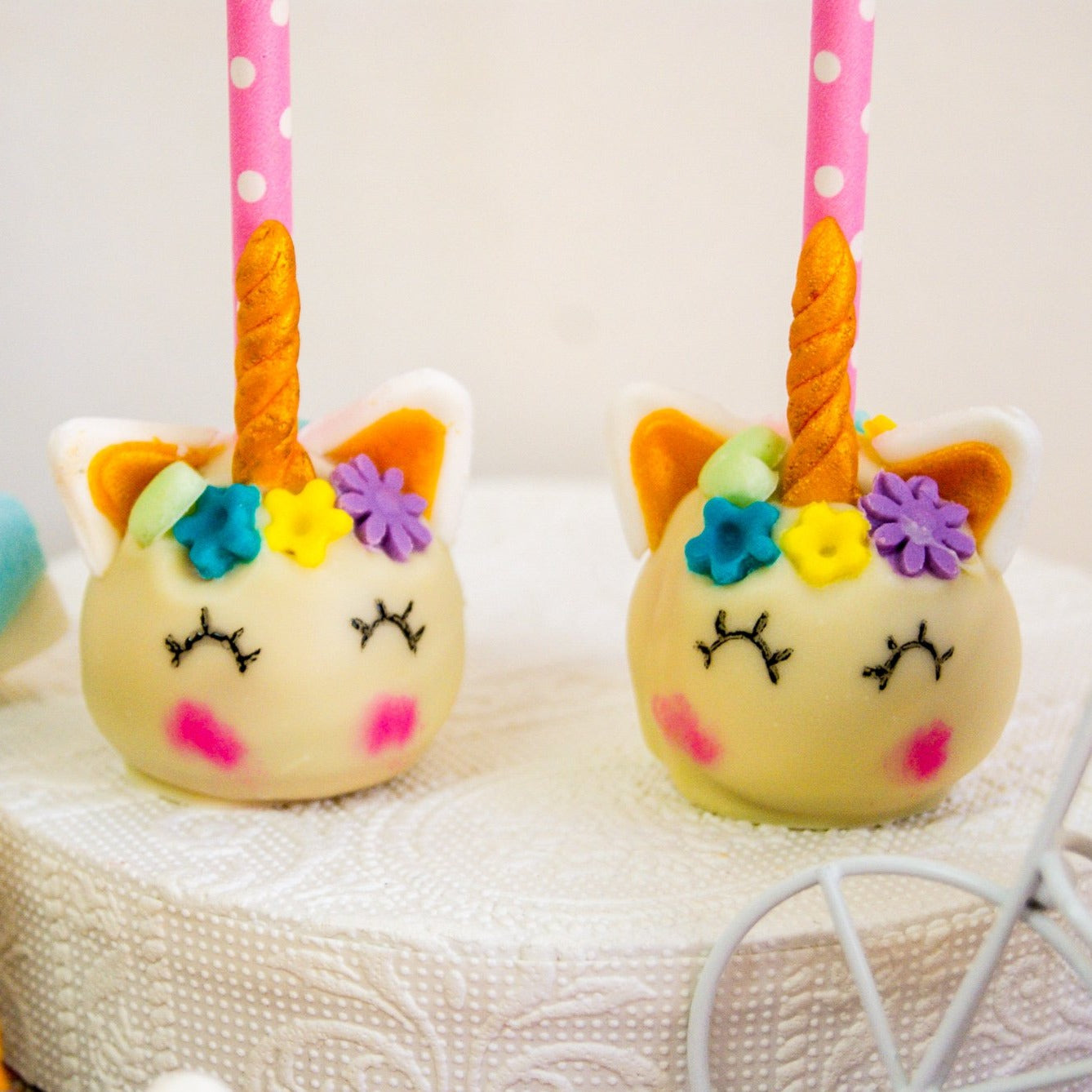 Bolitas de bizcocho de llamativos colores, pinchadas por su palo característico, recubiertas de chocolate de primera calidad y decoradas con motivos de los animales mitológicos que tanto están de moda, los unicornios.