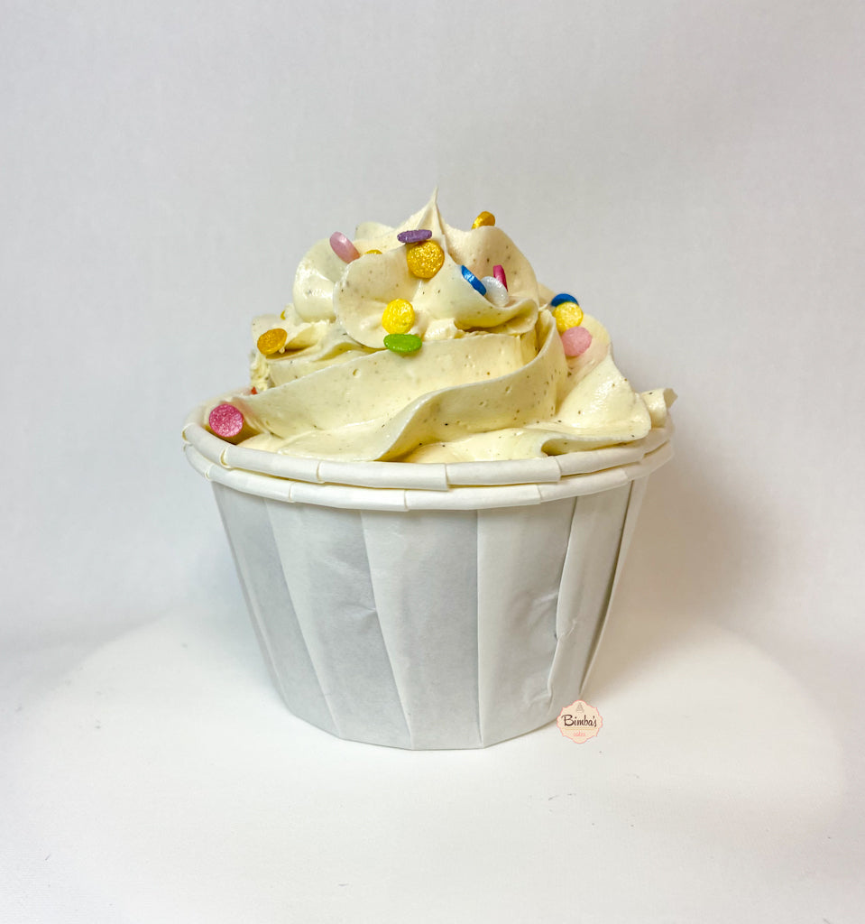 Pequeños mordiscos de bizcocho combinados con una deliciosa swiss merengue buttercream, decorados con sprinkles como la foto.