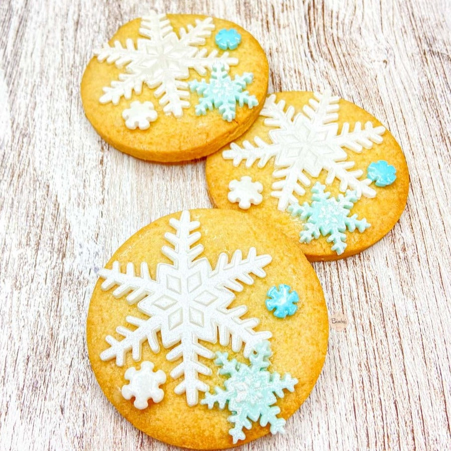 Deliciosas galletas de mantequilla decoradas con Estrellas de nieve de fondant, empaquetadas individualmente.