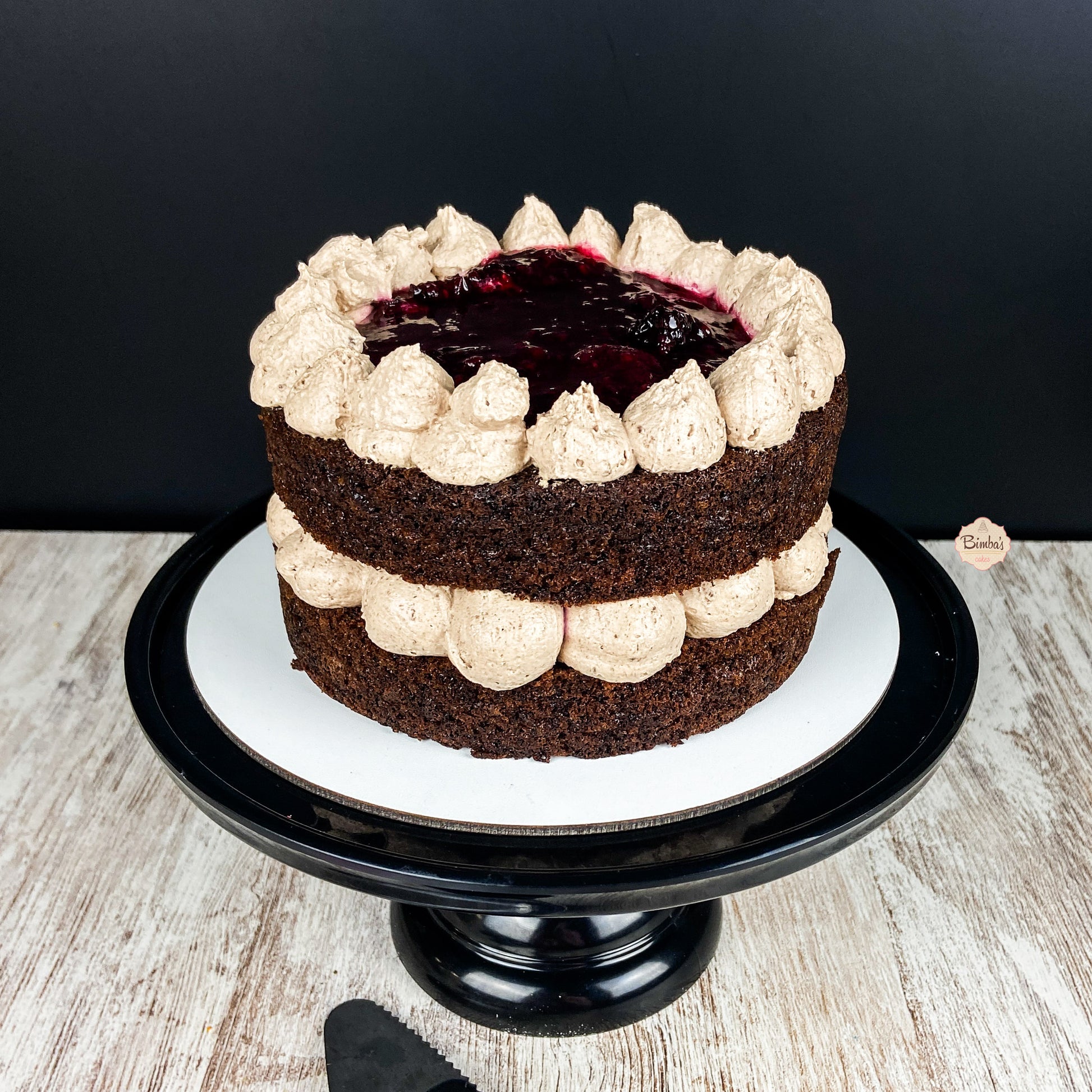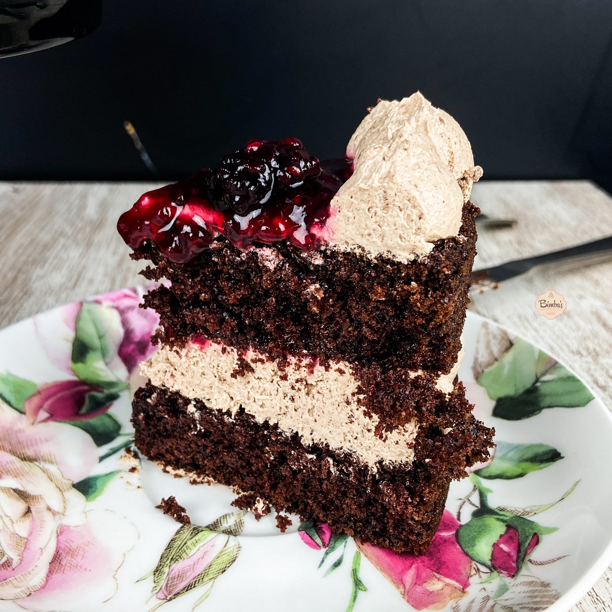 DELI-Choco: Bizcocho chocolate con mousse de choco con coulis de frutos rojos