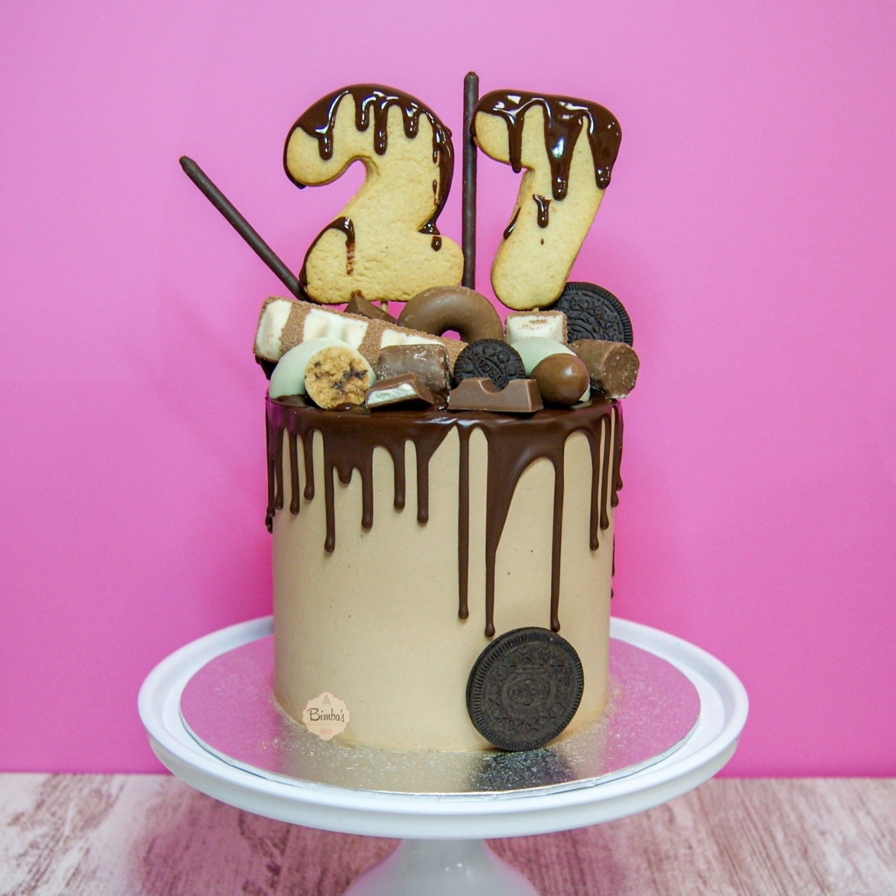 Decorada con unas gotas de chocolate y chocolatinas variadas, dándole el toque final con el número de la edad en galleta. (Pon la edad en los comentarios :))