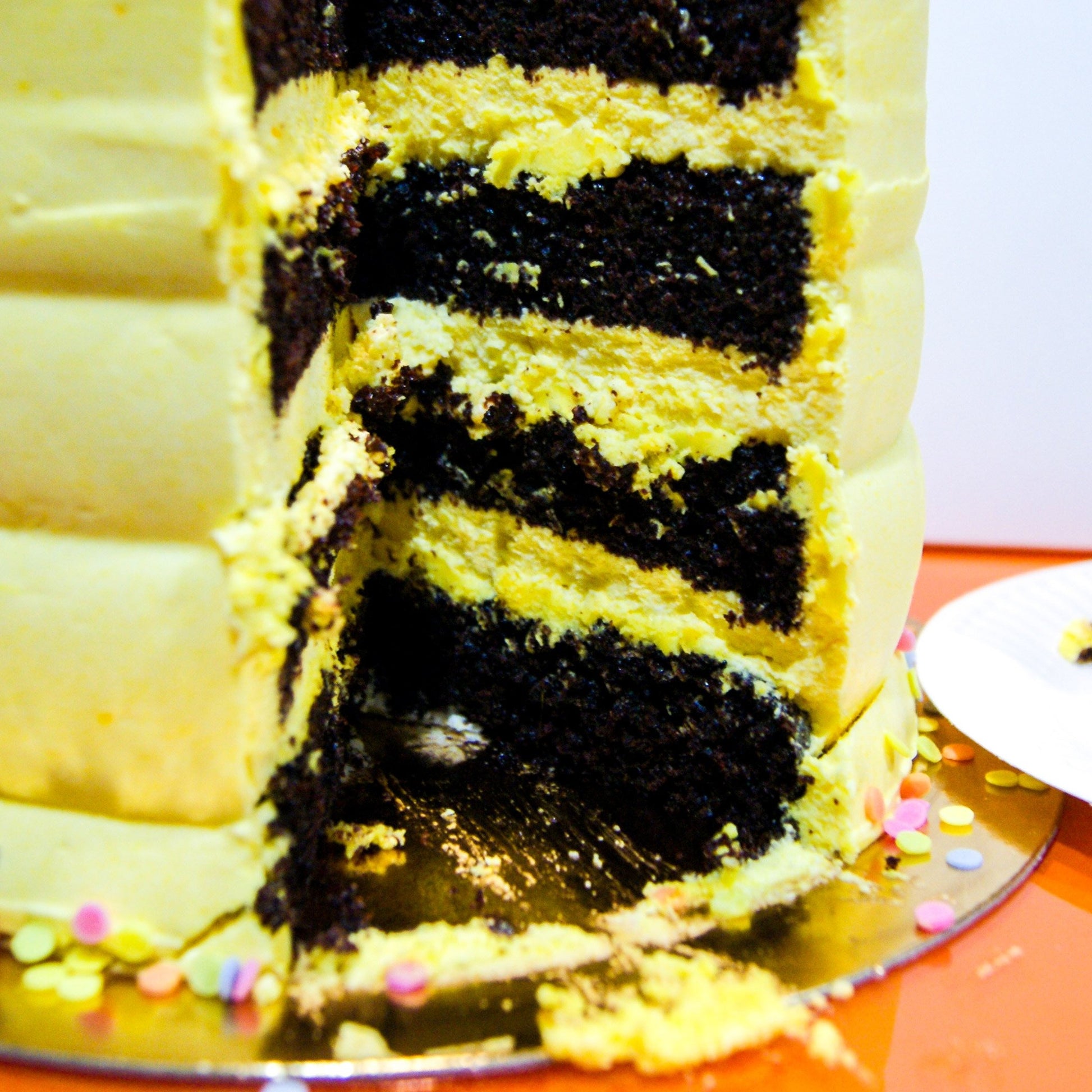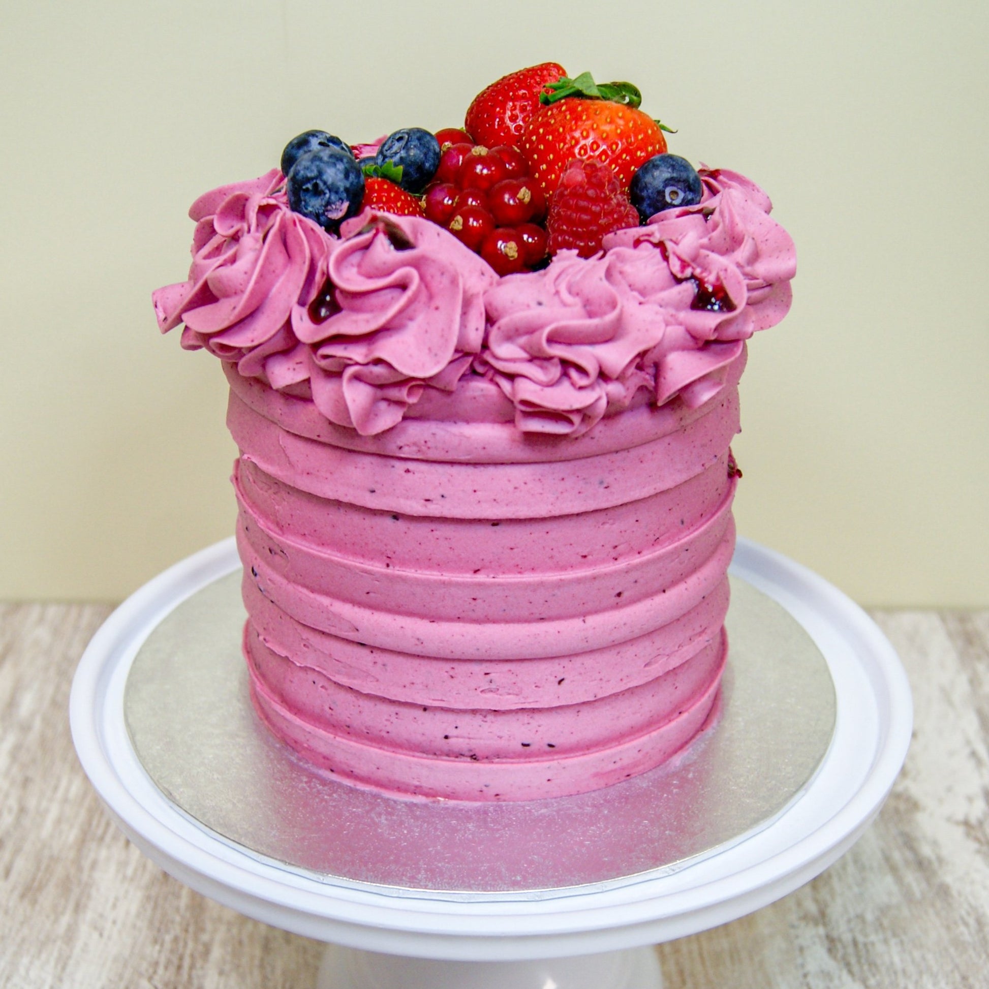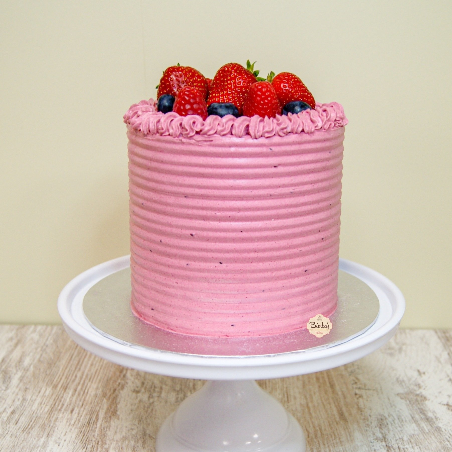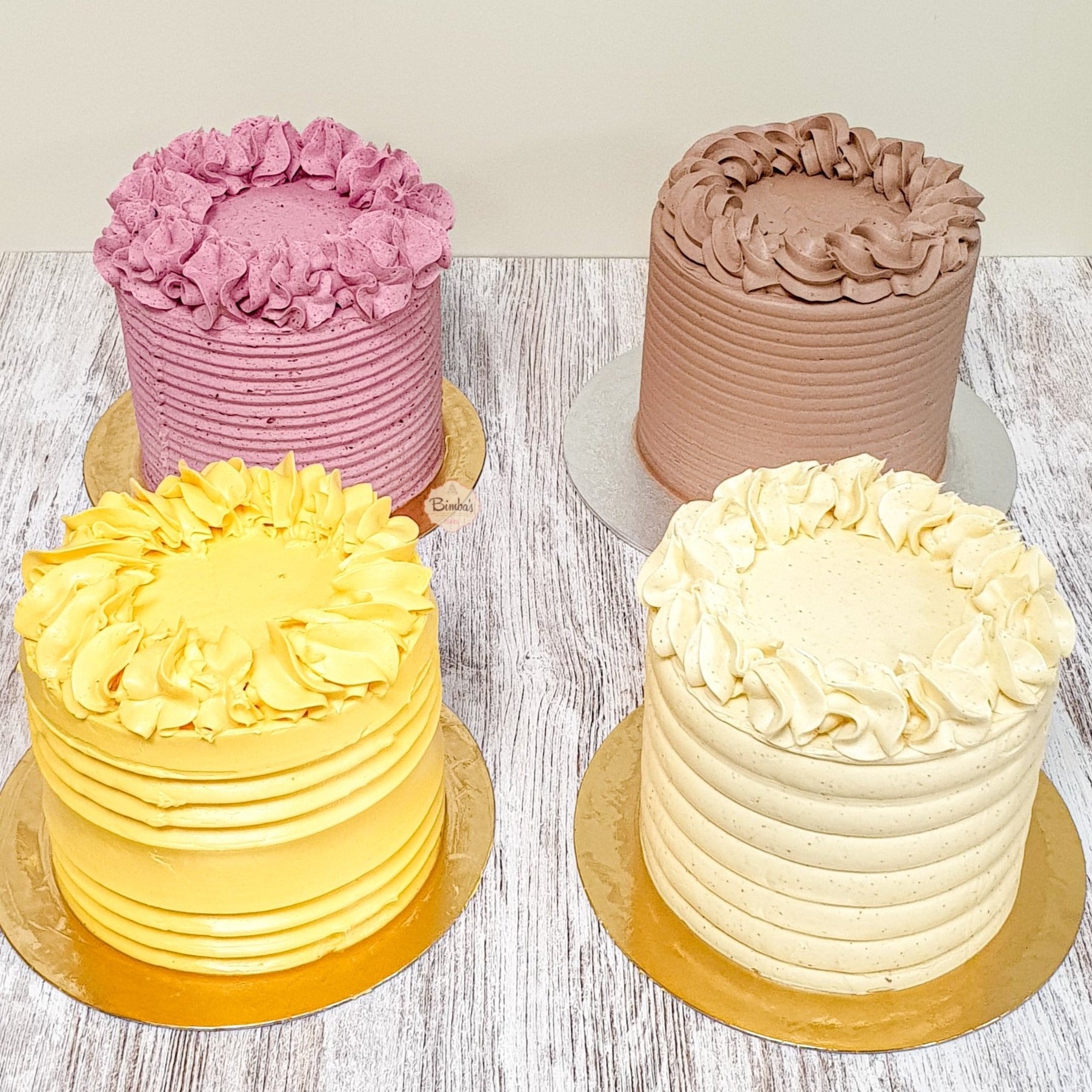 Tarta de tres capas de bizcocho intercalado con crema basada en merengue con un poco de mantequilla para dar estabilidad, de sabor a escoger, y recubierta externamente por la misma crema.