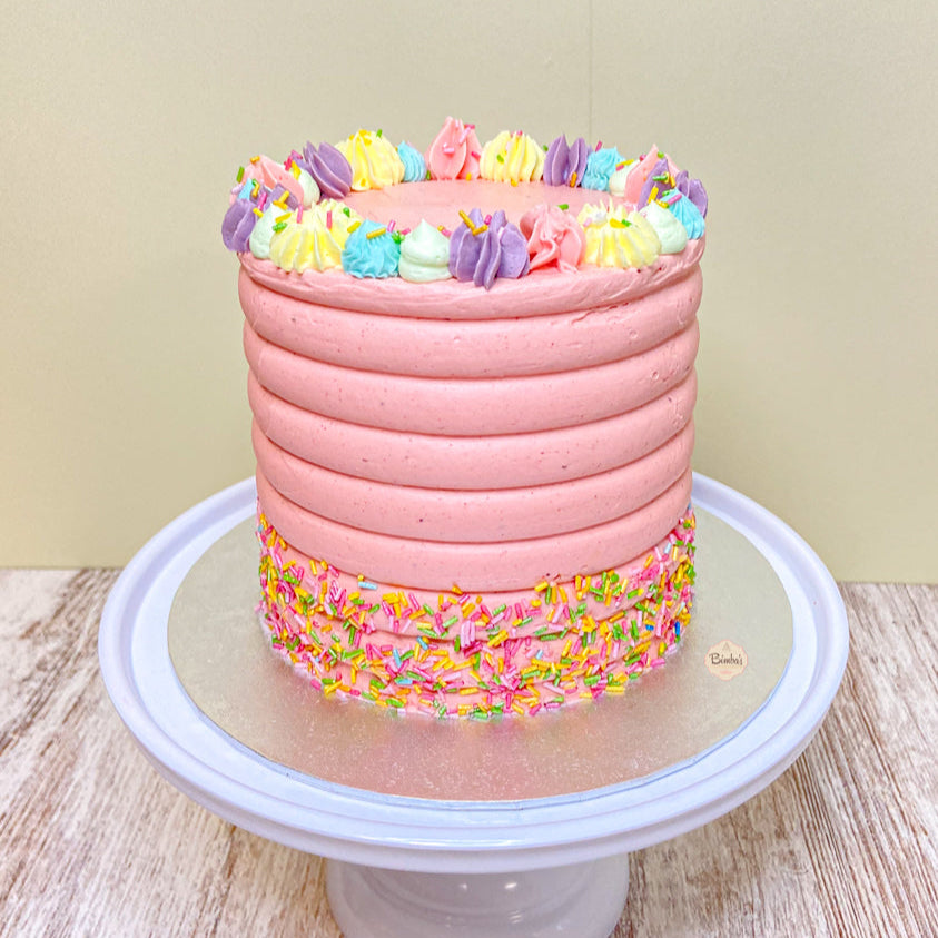 Tarta layer Fiesta, rellena de bizcocho de vainilla o chocolate y acabada con crema de diferentes sabores.