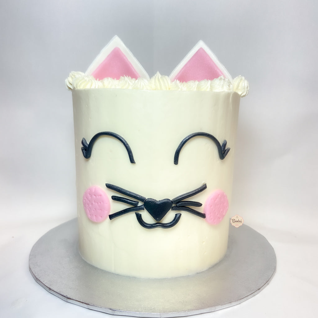 Tarta layer con carita de gato, rellena de bizcocho de vainilla o chocolate y acabada con crema de chocolate blanco