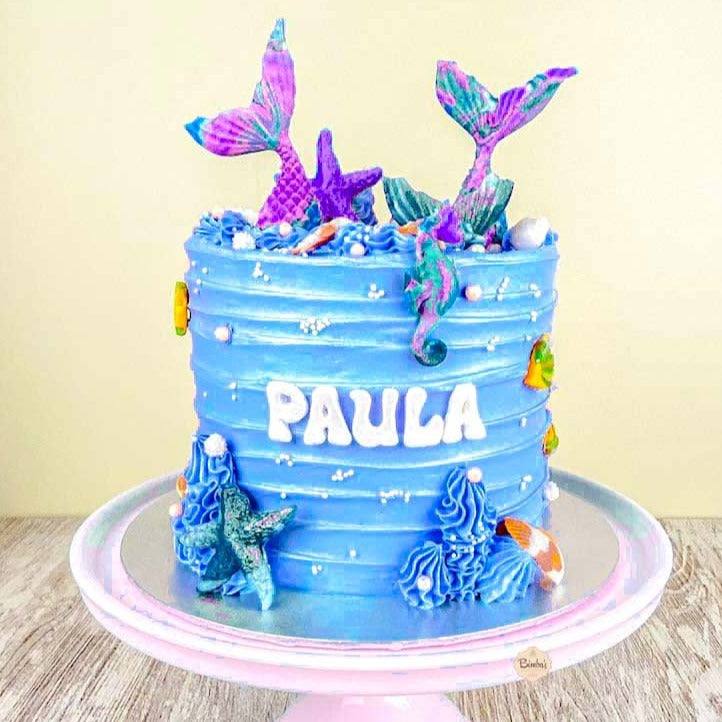 Tarta Sin Fondant Sirena se compone de bizcocho con crema intermedia y acabada con crema de chocolate blanco tintada azul para crear la sensación de Mar, lo acabamos de decorar con colas de sirena y otros detalles del fondo del mar de fondant.