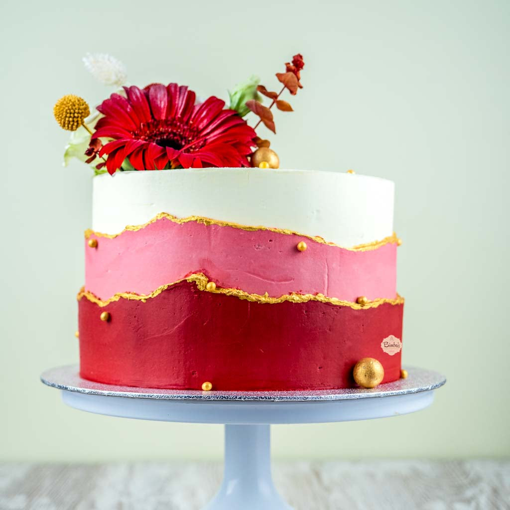 La Tarta Layer Tricolor es una tarta fina y elegante, con diferentes degradados de color y un toque dorado que dará un toque especial.