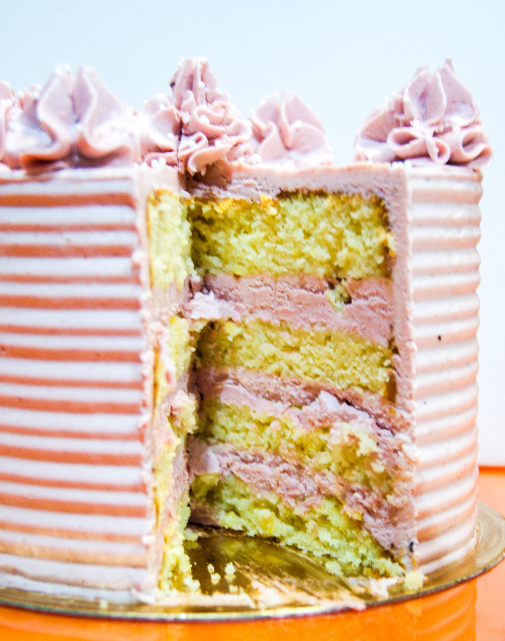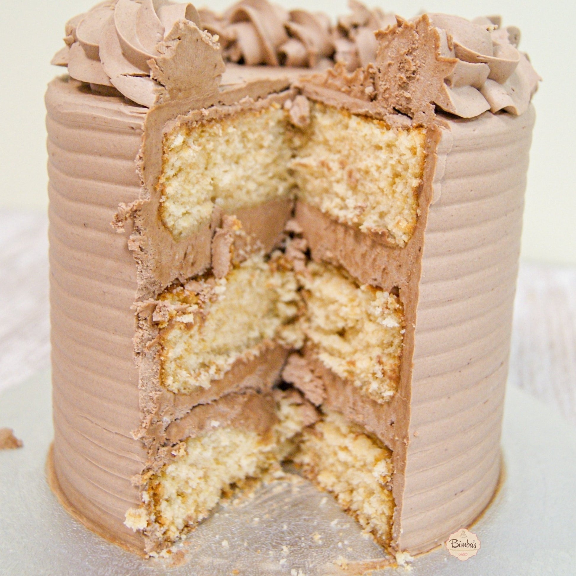 Tarta de tres capas de bizcocho intercalado con crema basada en merengue con un poco de mantequilla para dar estabilidad, de sabor a escoger, y recubierta externamente por la misma crema.