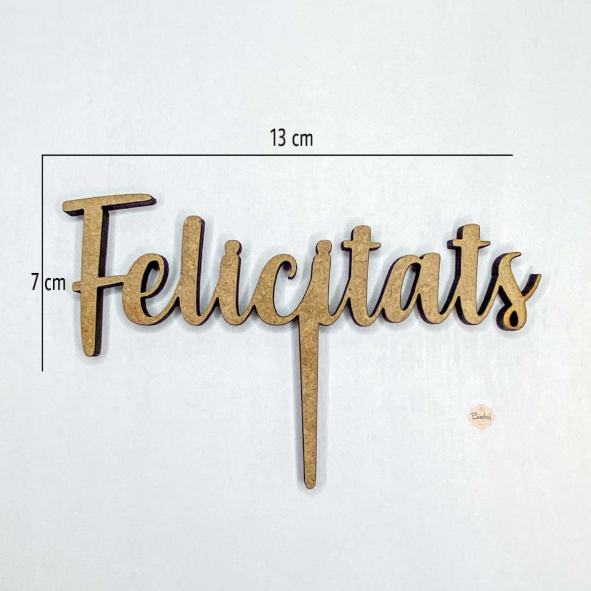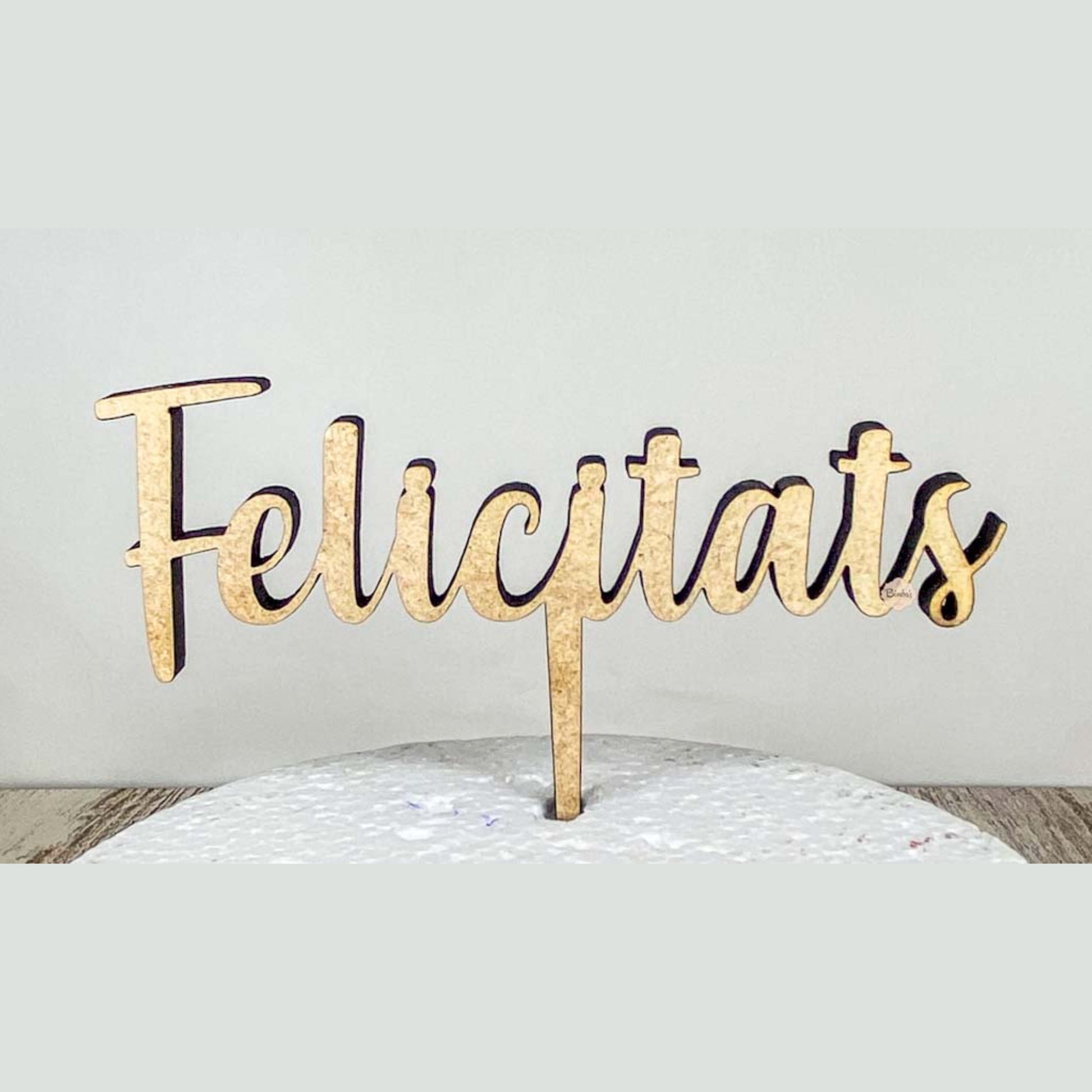 Topper Felicitats de madera de 13cm x 7cm de texto